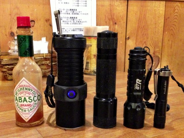 左からタバスコ(突っ込み防止)、NITECORE EA4、SUREFIRE 6P、GENTOS GTR-031T、FENIX LD01-R4